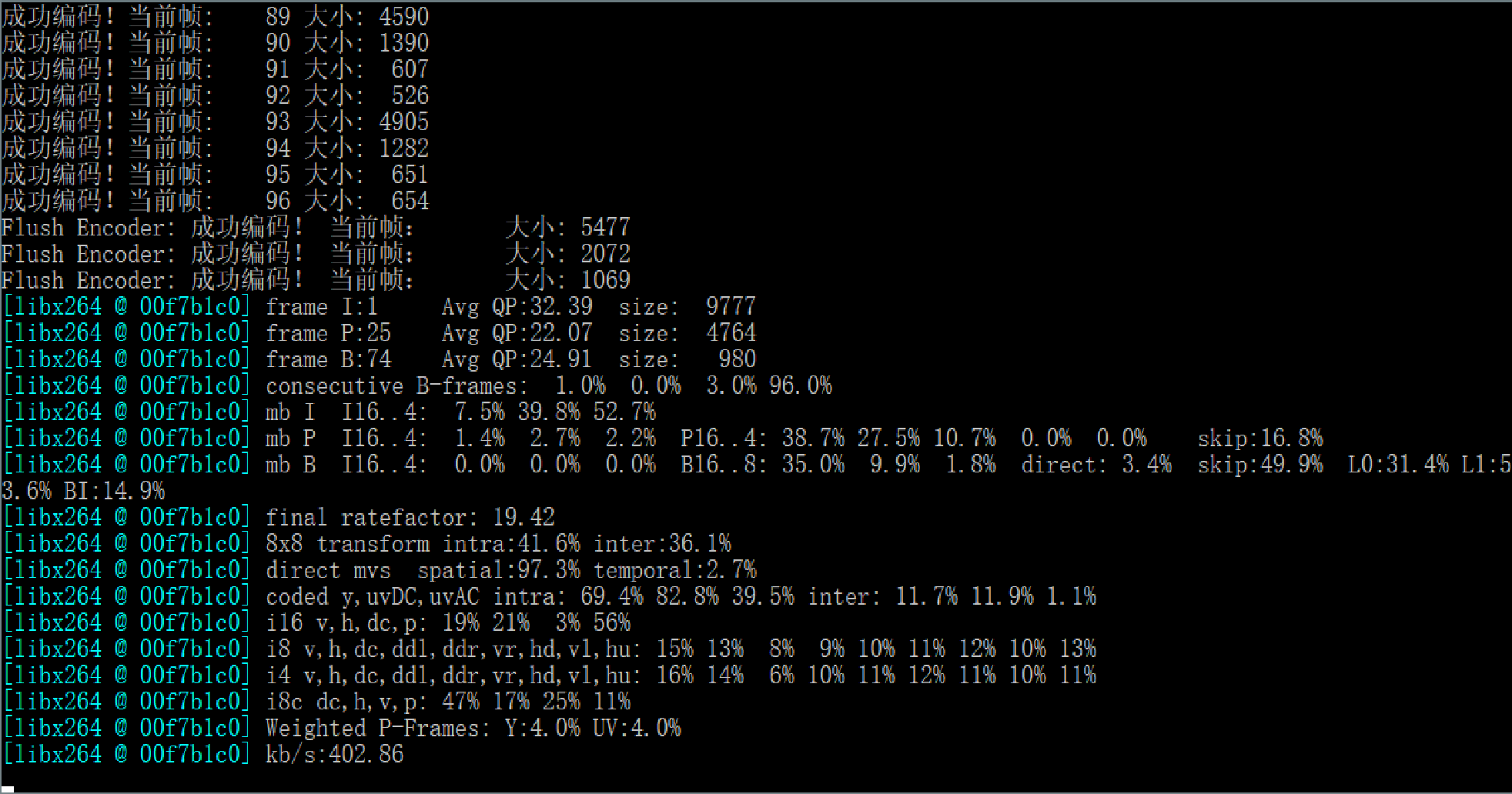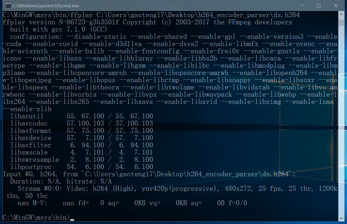 将编码后的h264使用FFmpeg中的ffplay命令播放测试,运行截图如下: