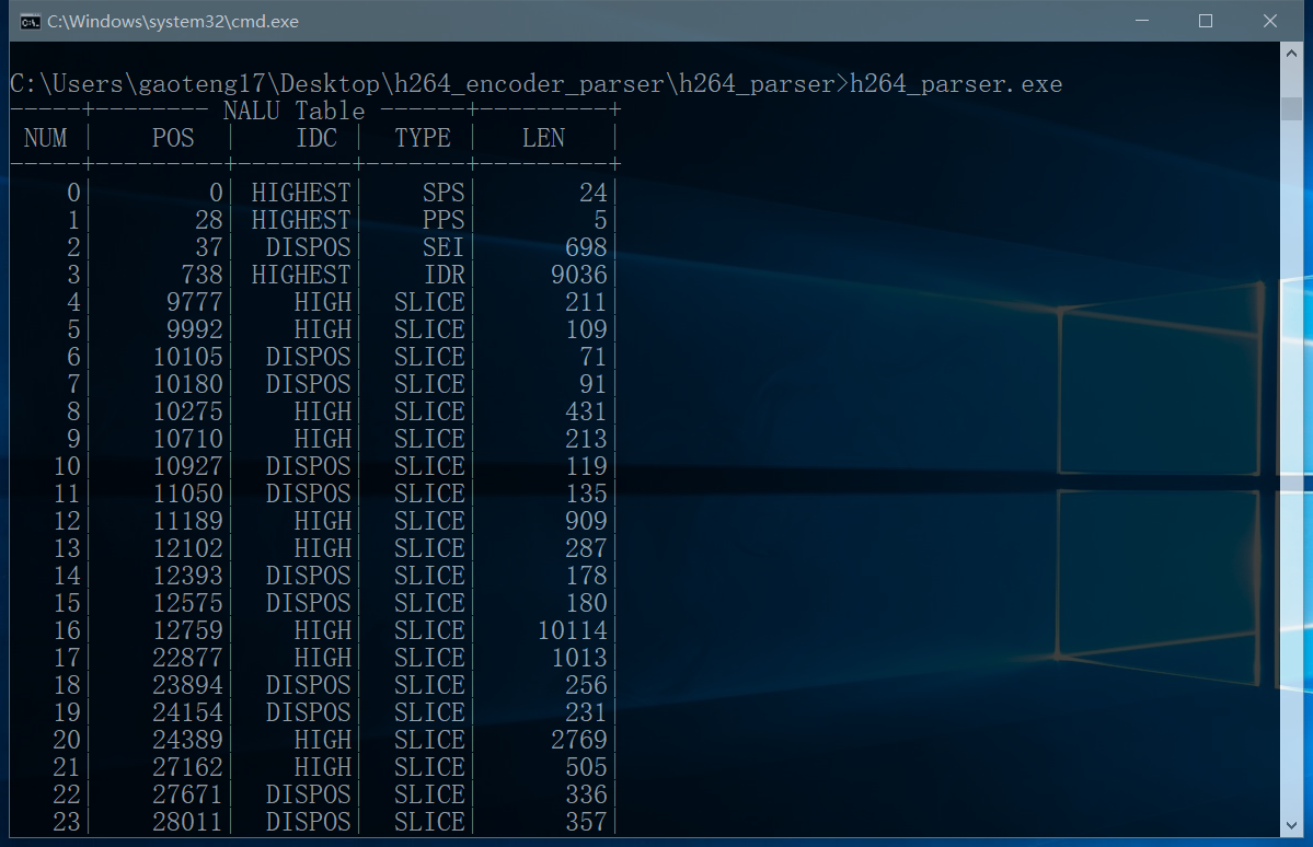 本程序的输入为一个H.264原始码流(裸流)的文件路径,输出为该码流的NALU统计数据,如下图所示。