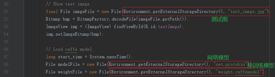 在Android Studio中导入caffe-mobile/examples/android/CaffeSimple项目,打开app/src/main/java/com/yangwenbo/caffesimple目录下的MainActivity.java,可以看到有关文件路径设置的代码。