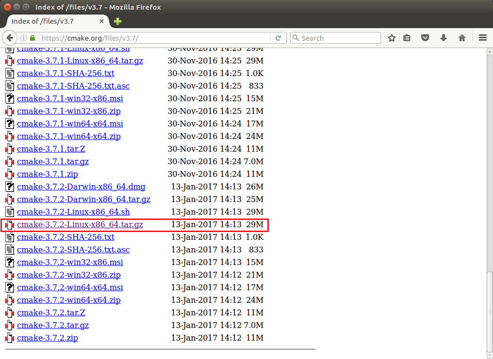 访问cmake官网(https://cmake.org/files/ ),找到3.7.2版本的下载得到cmake-3.7.2-Linux-x86_64.tar.gz