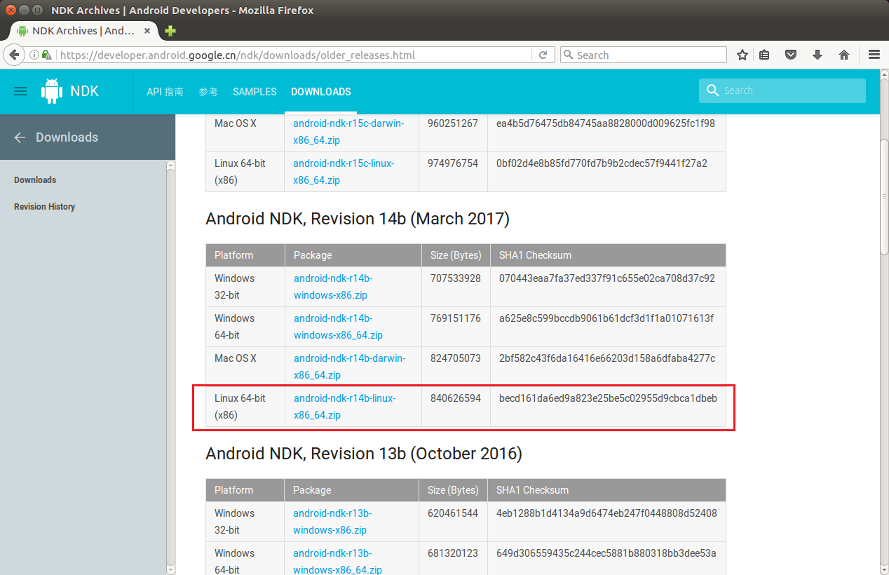 ndk的话到Android NDK官网(https://developer.android.google.cn/ndk/downloads/index.html )下载,这里选择android-ndk-r14b-linux-x86_64版本下载。