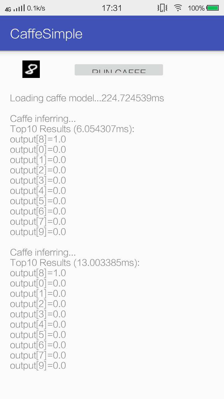 最后Build&Run,就可以体会Caffe在Android利用预训练模型预测手写字符 “8” 图片的过程和结果了。