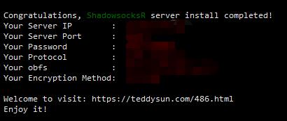 安装完成后提示成功,同时显示SSR的IP、端口、密码等相关配置