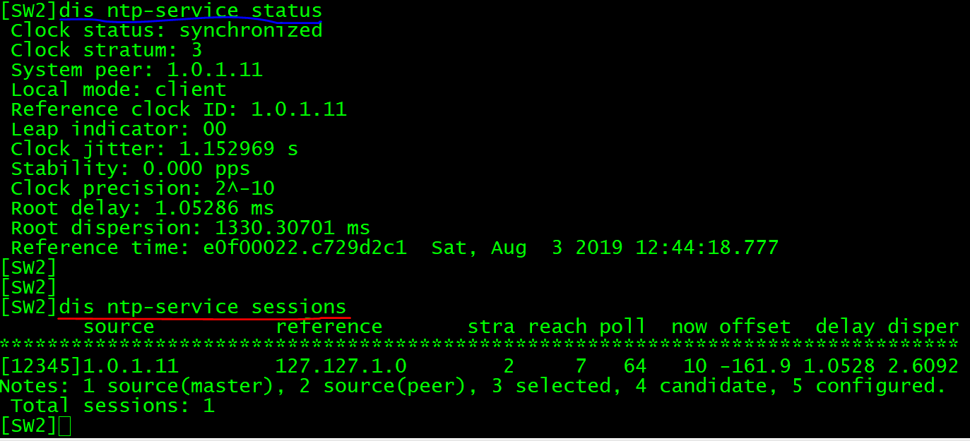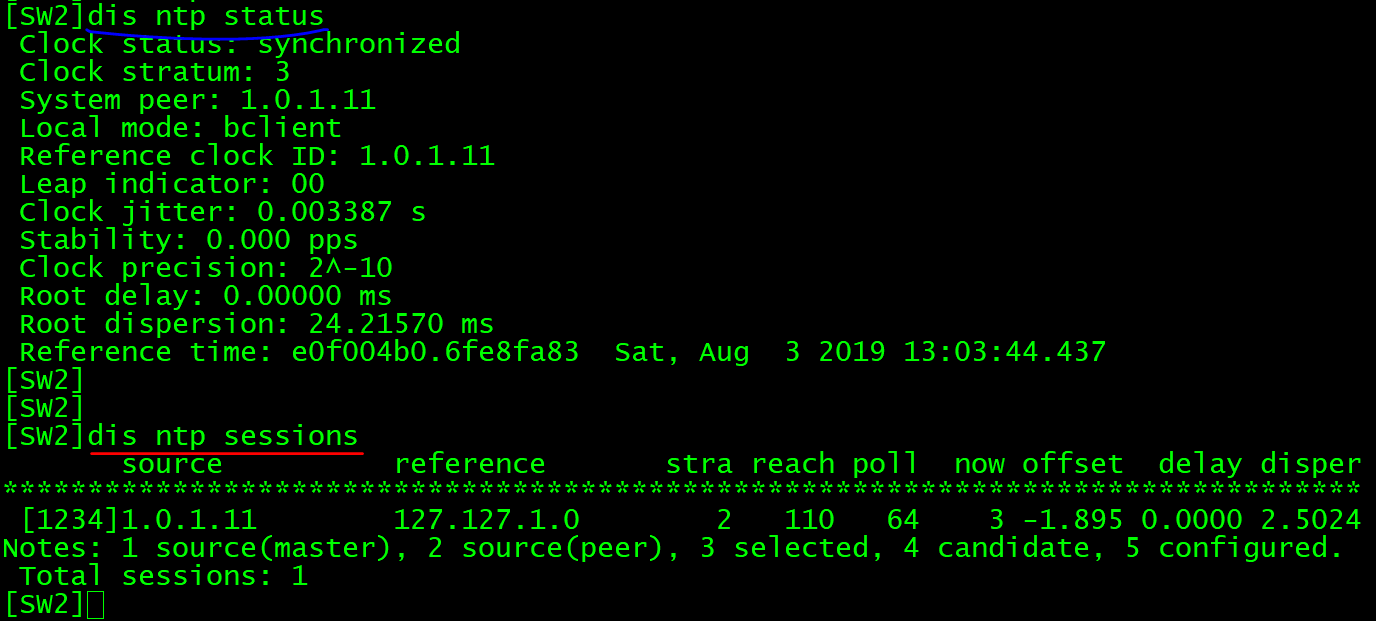 在SW2上查看NTP的运行状态及会话信息如下图: