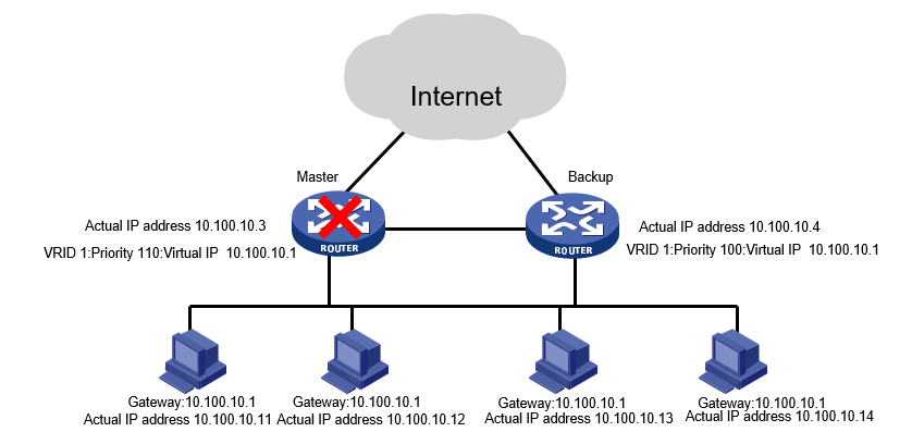 [SWB]dis vrrp verbose IPv4 virtual router information: Running mode : Standard Total number of virtual routers : 1 Interface Vlan-interface10 VRID : 1 Adver timer : 100 centiseconds Admin status : Up State : Backup Config pri : 100 Running pri : 100 Preempt mode : Yes Delay time : 0 centiseconds Become master : 2930 millisecond left Auth type : None Virtual IP : 192.168.0.254 Master IP : 192.168.0.252