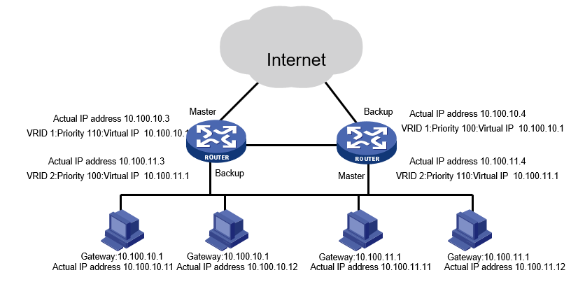 [SWB]dis vrrp verbose IPv4 virtual router information: Running mode : Standard Total number of virtual routers : 1 Interface Vlan-interface10 VRID : 1 Adver timer : 100 centiseconds Admin status : Up State : Master Config pri : 100 Running pri : 100 Preempt mode : Yes Delay time : 0 centiseconds Auth type : None Virtual IP : 192.168.0.254 Virtual MAC : 0000-5e00-0101 Master IP : 192.168.0.253