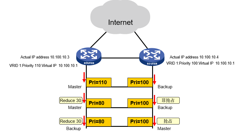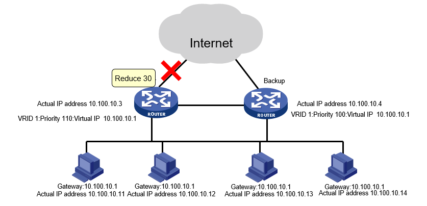 [SWA]dis vrrp verbose IPv4 virtual router information: Running mode : Standard Total number of virtual routers : 1 Interface Vlan-interface10 VRID : 1 Adver timer : 100 centiseconds Admin status : Up State : Backup Config pri : 120 Running pri : 90 Preempt mode : Yes Delay time : 0 centiseconds Become master : 3090 millisecond left Auth type : None Virtual IP : 192.168.0.254 Master IP : 192.168.0.253 VRRP track information: Track object : 1 State : Negative Pri reduced : 30