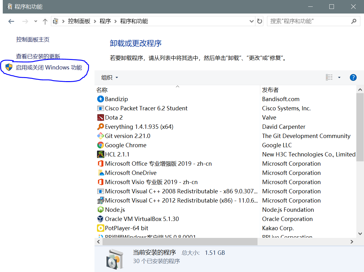 在控制面板->程序与功能中点击启用或关闭windows功能:
