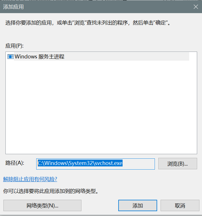 在允许其他应用里添加C:\Windows\System32\svchost.exe: