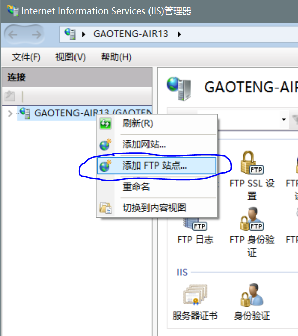 在win10电脑上开启ftp服务,创建ftp站点,使局域网内其它pc可以访问。
