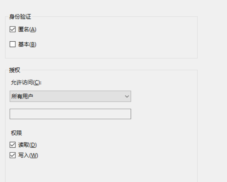 身份验证和授权信息中选择允许匿名登录、授权所有用户,并给予权限: