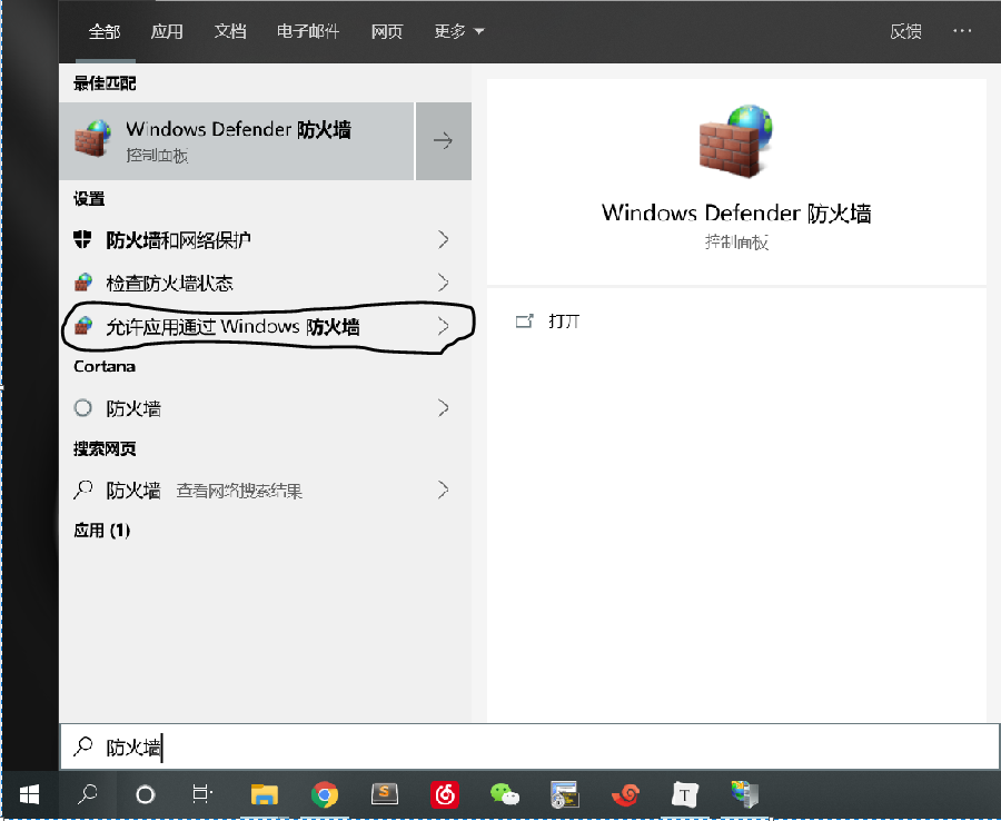 搜索框搜防火墙,打开允许应用通过Windows防火墙: