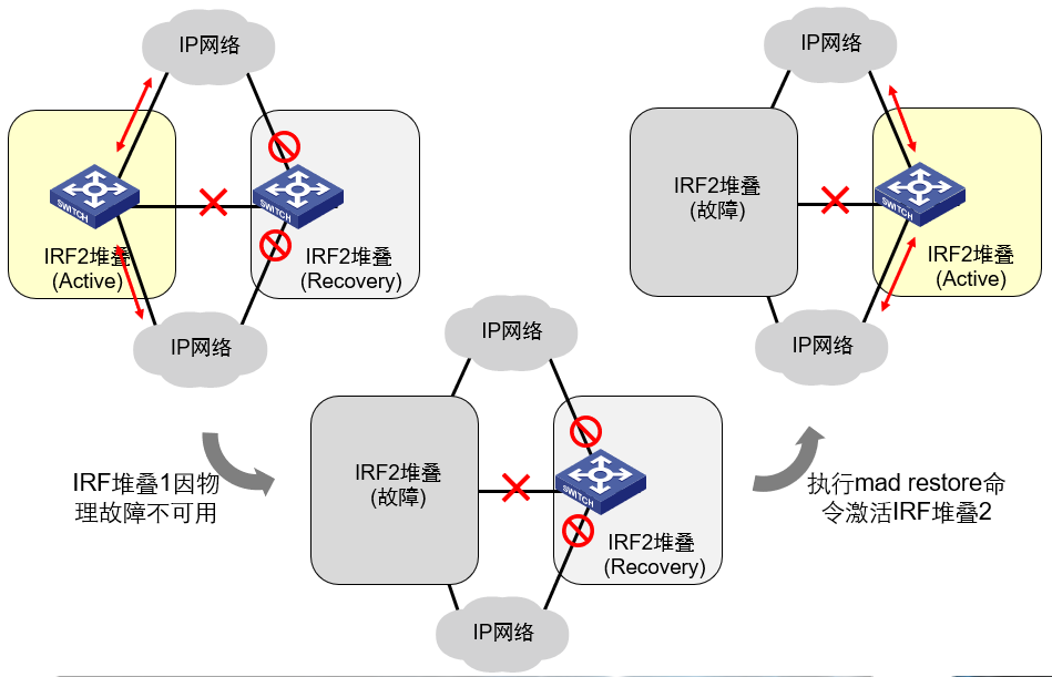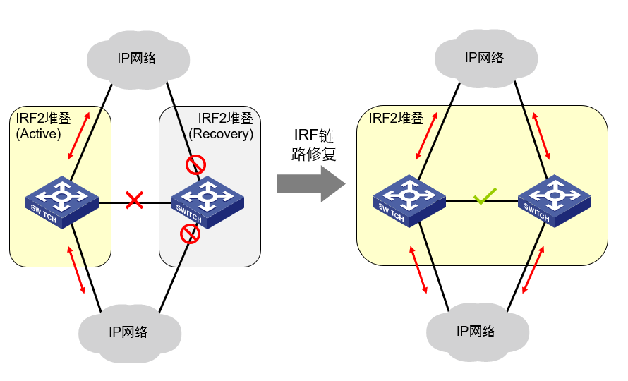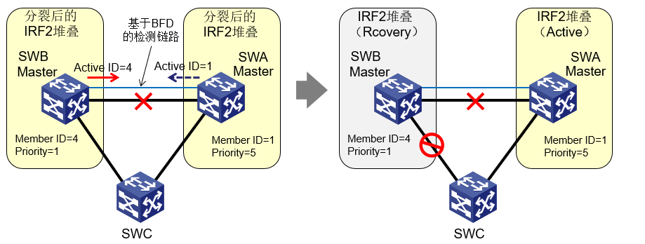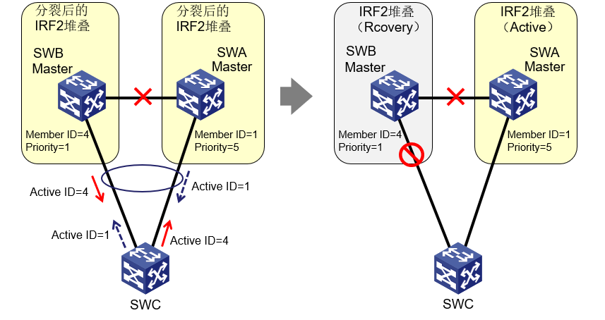 # 重命名member号为2 [SWB]irf member 1 renumber 2 Renumbering the member ID may result in configuration change or loss. Continue?[Y/N]:y [SWB]quit <SWB>reboot