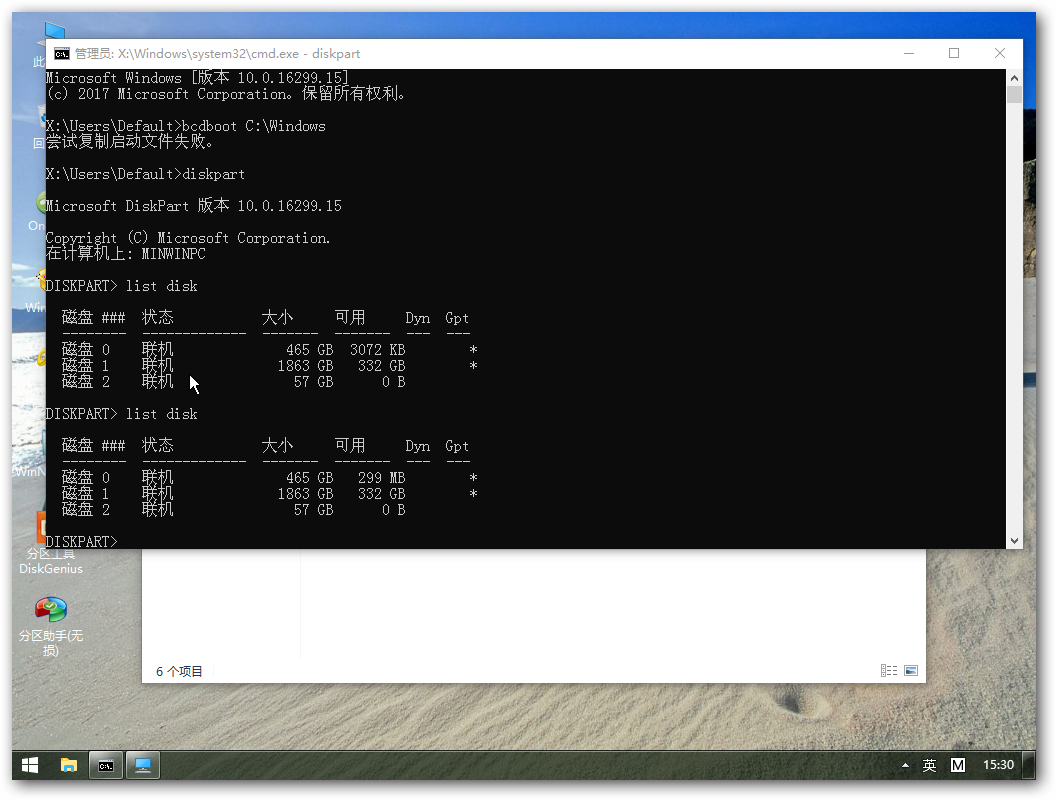 使用PE中的diskgenius工具,在磁盘上分配一部分空余空间(我分配了300M)。