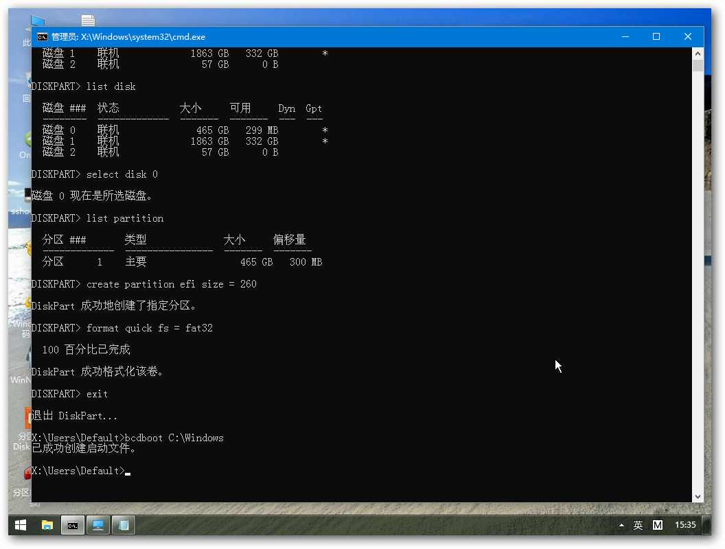 进入PE,打开命令行界面,如果EFI分区还在的话,直接使用如下命令:
