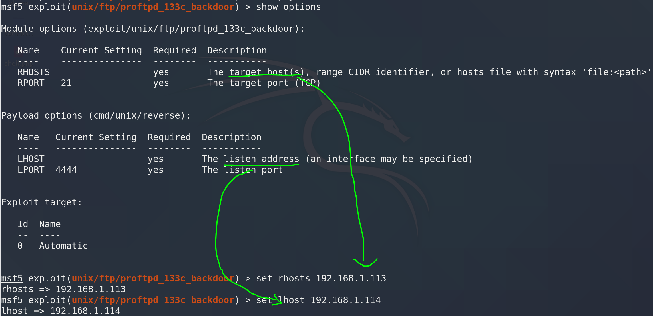 | >set rhosts 192.168.1.113 >set lhost 192.168.1.114