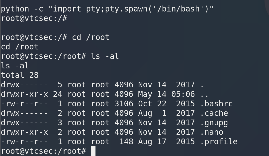 - 优化shell,切换到根目录拿到flag,这里是有flag的,可能我这个靶机镜像被之前的使用者删掉了: