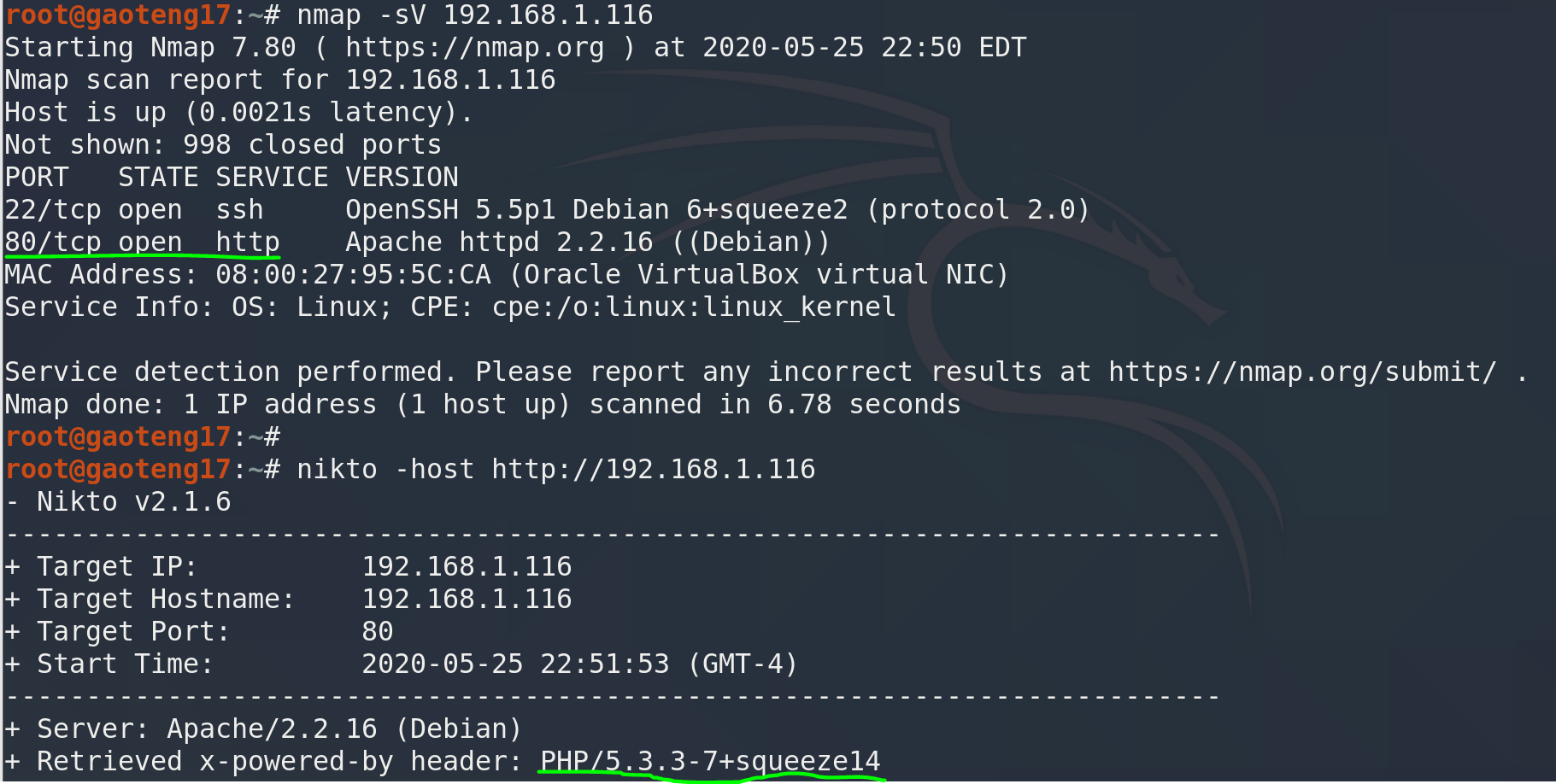 51CTO的网课,本篇利用nmap搜索开放端口,dirb挖掘敏感目录,使用owasp zap扫描可利用漏洞,用sqlmap进行get参数注入,获取用户名和口令,上传反弹shell,获得权限,拿到flag。
