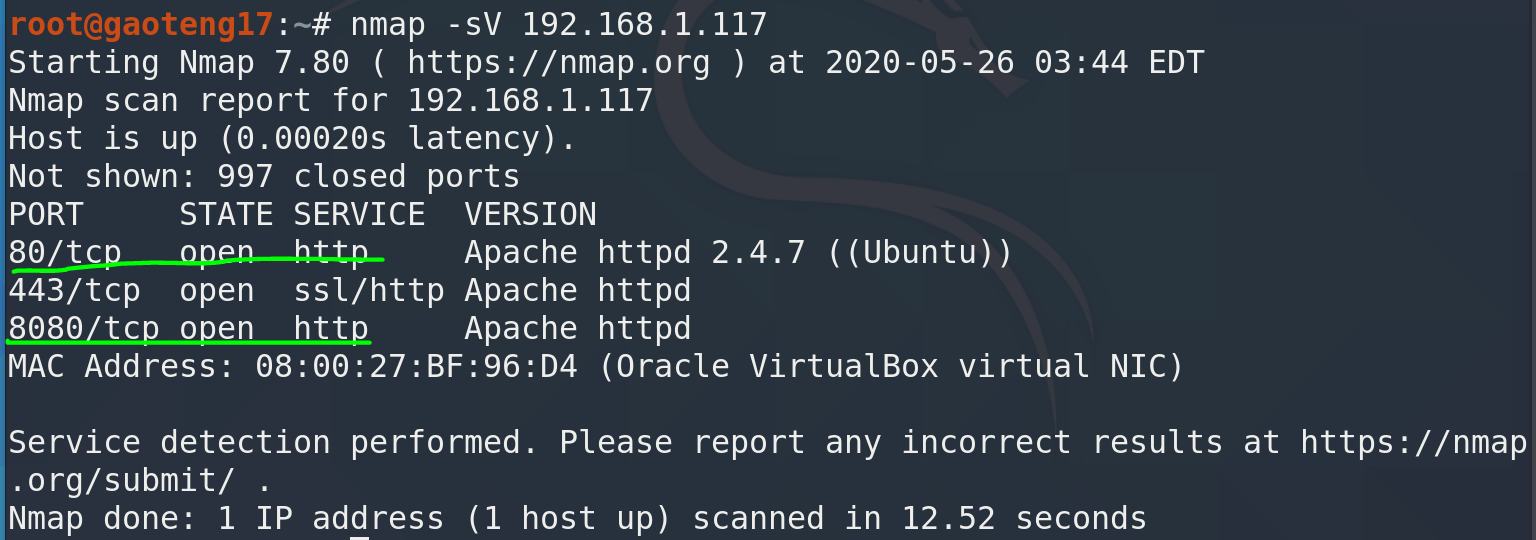- nmap扫描靶机IP地址开放端口,两个web服务: