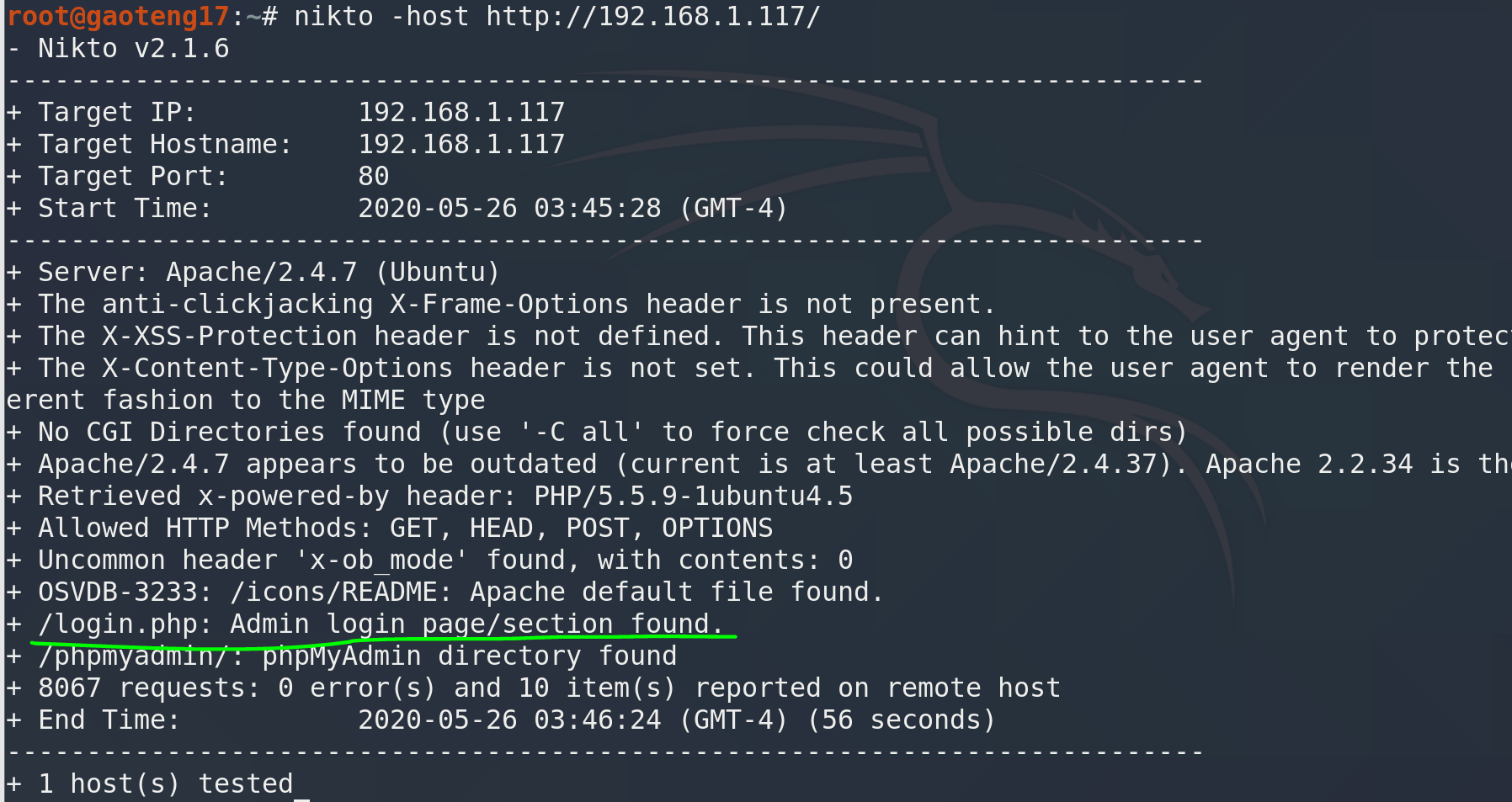 | nikto -host http://192.168.1.117/ nikto -host http://192.168.1.117:8080/