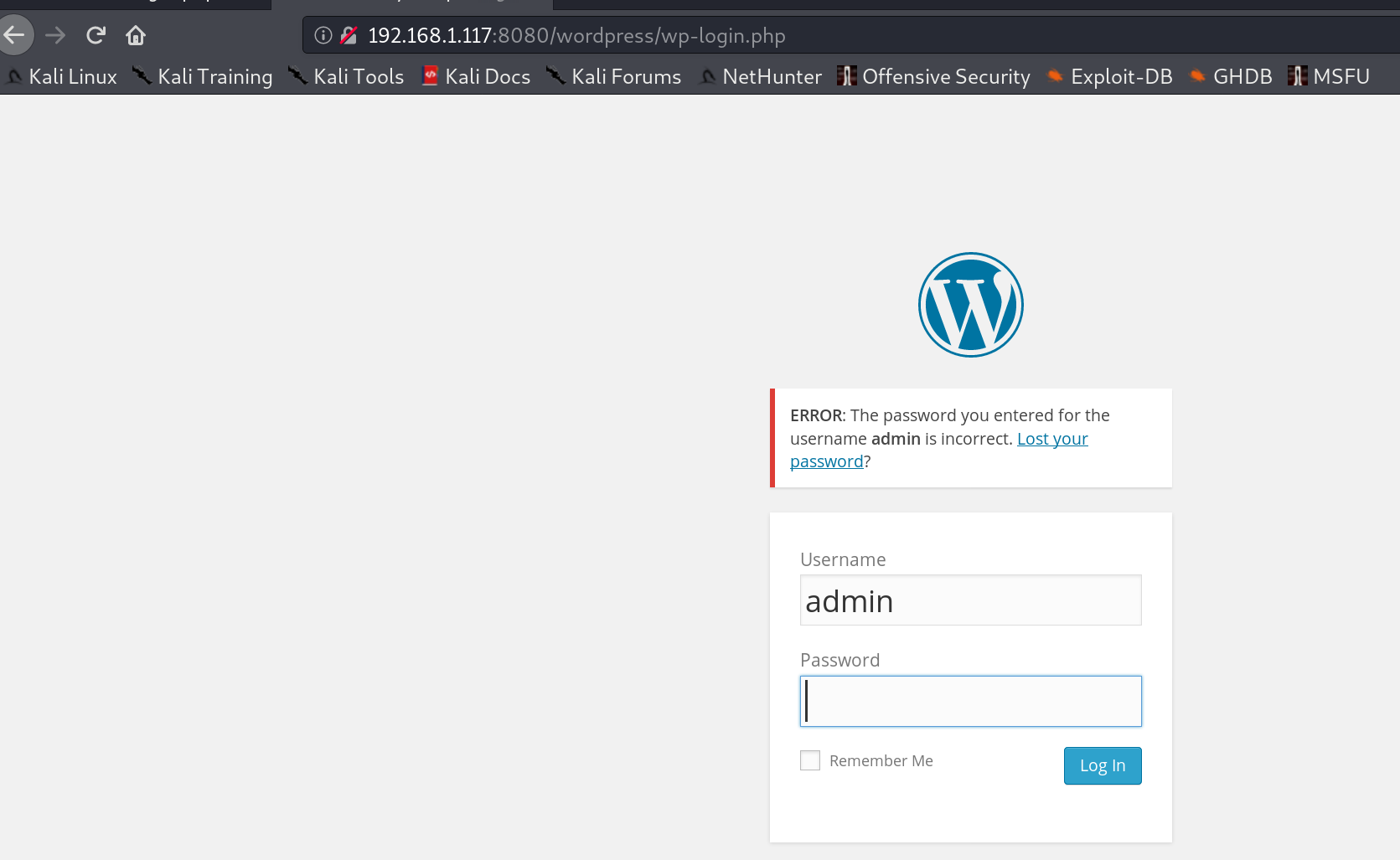 /wordpress/wp-login.php成功找到登录界面,这个页面用dirb也能扫出来,不过有点慢,尝试弱口令admin登录同样失败: