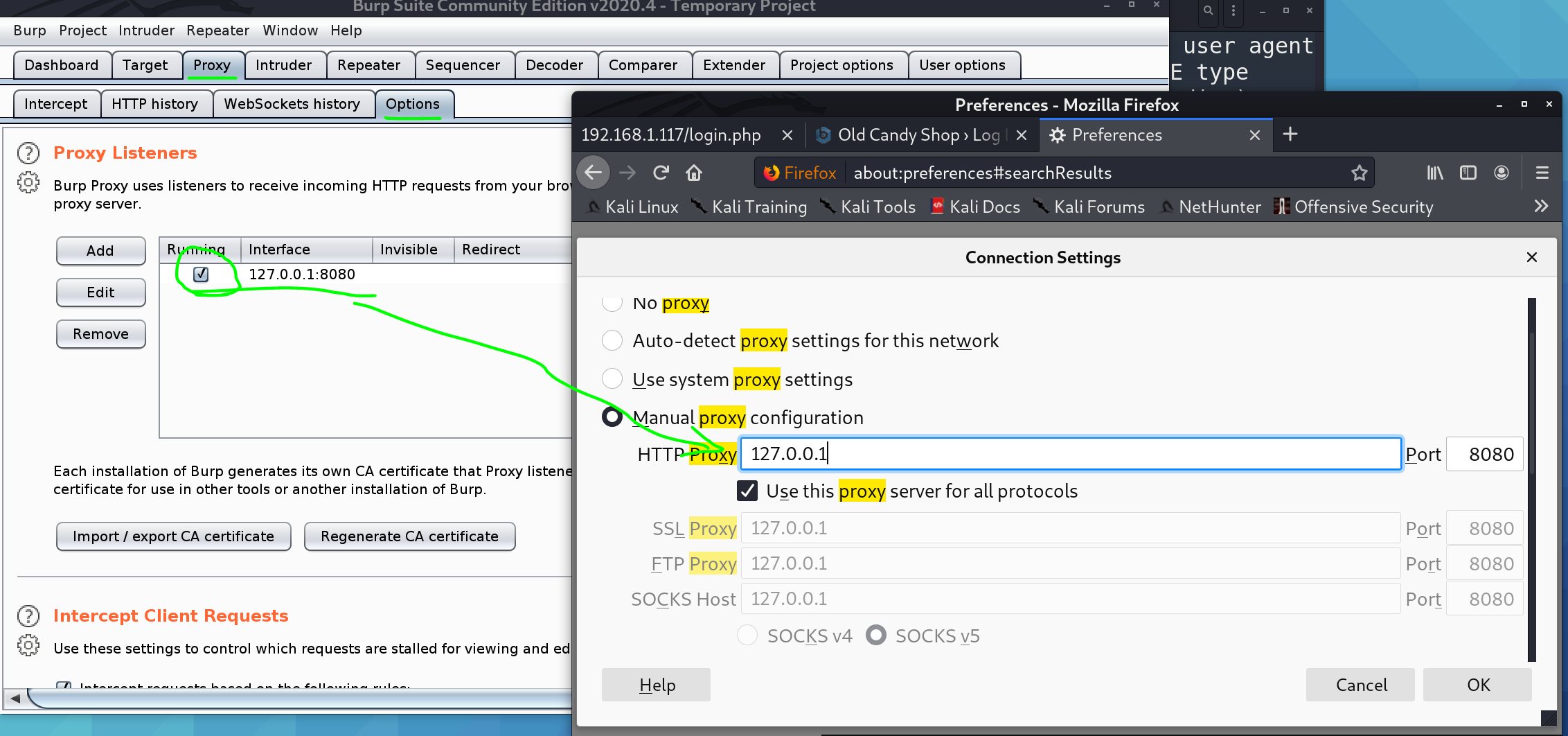 - 使用burpsuite,首先设置与浏览器的代理ip和端口一致: