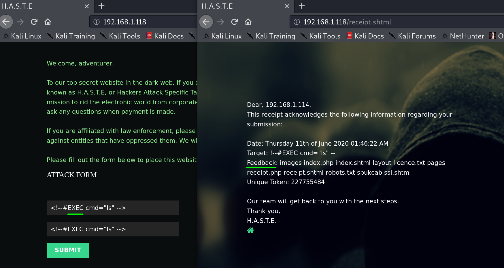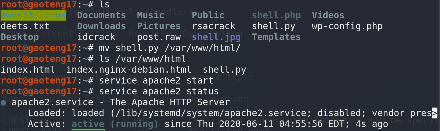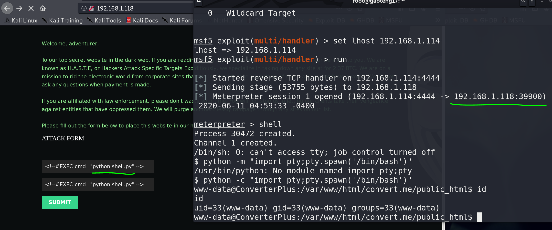 51CTO的网课,本篇利用nmap搜索开放端口,nikto、dirb挖掘敏感目录,利用SSI漏洞进行代码注入,执行python反弹shell,使用metasploit监听,获得shell。