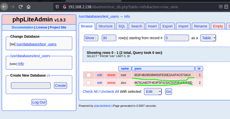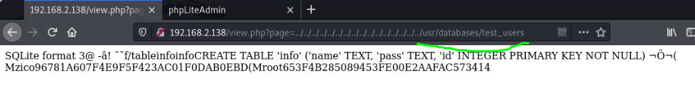 - 访问登录页面,尝试弱口令admin成功登录,里面有一个表有两个用户的MD5密码,在线解密了尝试登录ssh,但是失败了:
