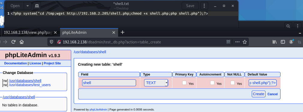 - 新建一个表,插入一段下载反弹shell的TEXT: