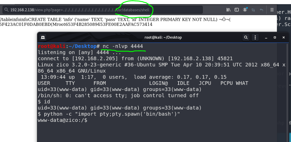 - 开启nc监听,修改目录为反弹shell目录。获得低权shell:
