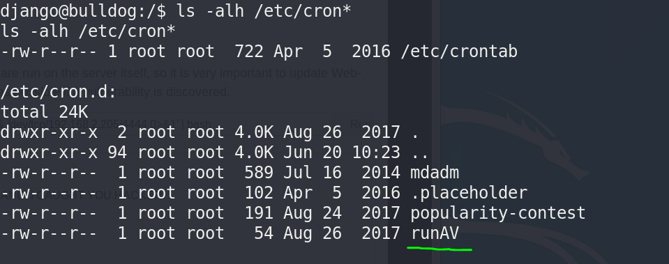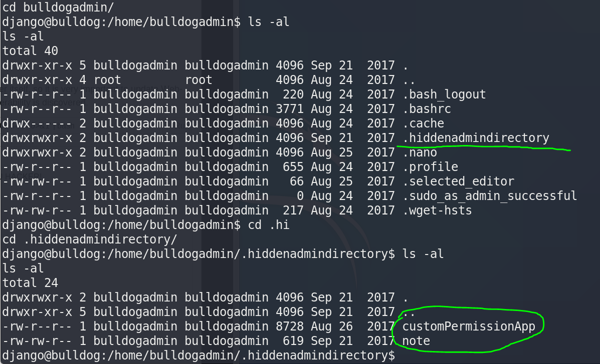 - 切到bulldogadmin用户目录下,找着一个隐藏的敏感目录,打开里面有俩文件: